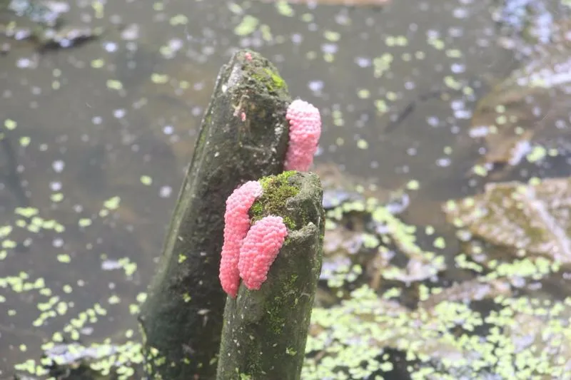 蕪雜的環(huán)境又滋生了大量的蚊蟲和具有血吸蟲病傳染危害的釘螺,水體散發(fā)出陣陣難聞的異味,讓人敬而遠(yuǎn)之。如果稍稍觀察水岸邊,還會(huì)發(fā)現(xiàn)石塊和植物枝葉上有一團(tuán)團(tuán)紅色的異物,那是福壽螺產(chǎn)的卵,一種對(duì)環(huán)境產(chǎn)生很大破壞的入侵物種,它們不僅貪婪啃食周圍各種植物,還會(huì)因攜帶寄生蟲(如廣州管圓病蟲等)而傳播疾病,導(dǎo)致這一區(qū)域的水體生態(tài)環(huán)境進(jìn)一步失衡,淪為一片死氣沉沉的臭水塘,嚴(yán)重影響了黑龍灘區(qū)域整體的水生態(tài)健康。