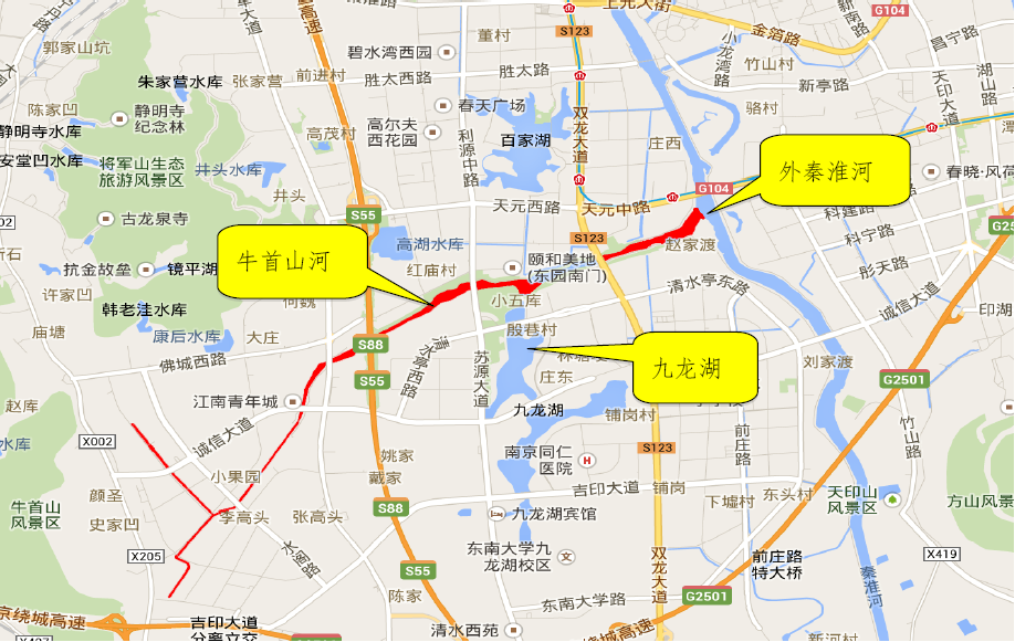 牛首山河總長約8公里,貫穿南京市整個江寧經(jīng)濟(jì)技術(shù)開發(fā)區(qū)。沿岸有美麗的九龍湖公園和眾多高檔住宅小區(qū),是周邊居民閑暇散步垂釣的好去處。