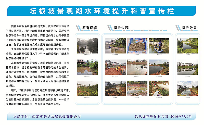 2015年12月12日,中科水治理參與的壇板坡景觀湖水生態(tài)構(gòu)建工程正式開工,景觀湖位于中心街區(qū)的東部,分為壇湖和板湖兩個(gè)獨(dú)立的水體,是典型的農(nóng)村污染型水體。水體總面積約15畝,平均水深1.5米,采用中科水治理獨(dú)創(chuàng)的“清水型生態(tài)系統(tǒng)構(gòu)建技術(shù)”,主要建設(shè)內(nèi)容包括基底改良、湖形重塑、微生物菌種投放、沉水植物群落構(gòu)建、挺水、浮葉植物群落構(gòu)建、魚類放養(yǎng)、大型底棲動(dòng)物投放等。2016年3月30日,項(xiàng)目順利通過驗(yàn)收。